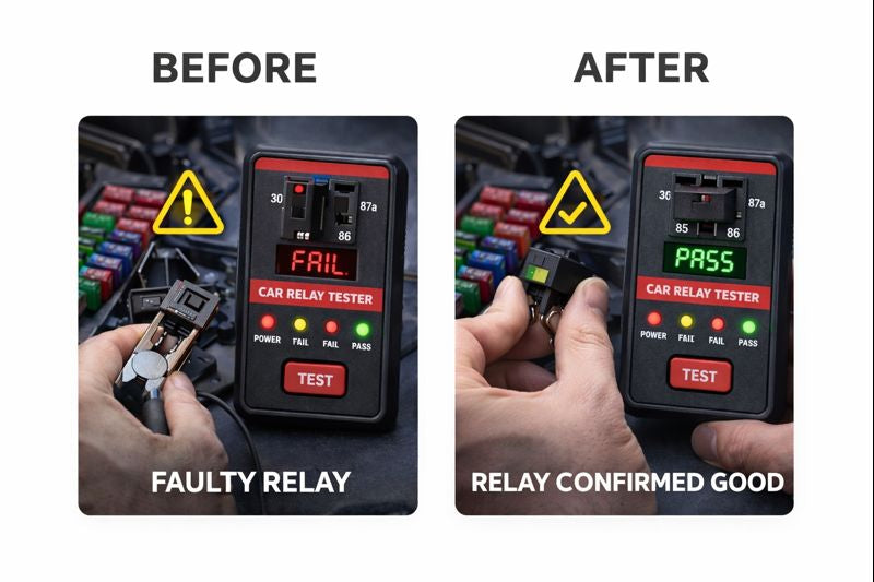 Unlike passive tools, our device actively simulates real-world load conditions and cycles relays rapidly to catch intermittent faults. Get instant, accurate red or green light results without complex multimeters.